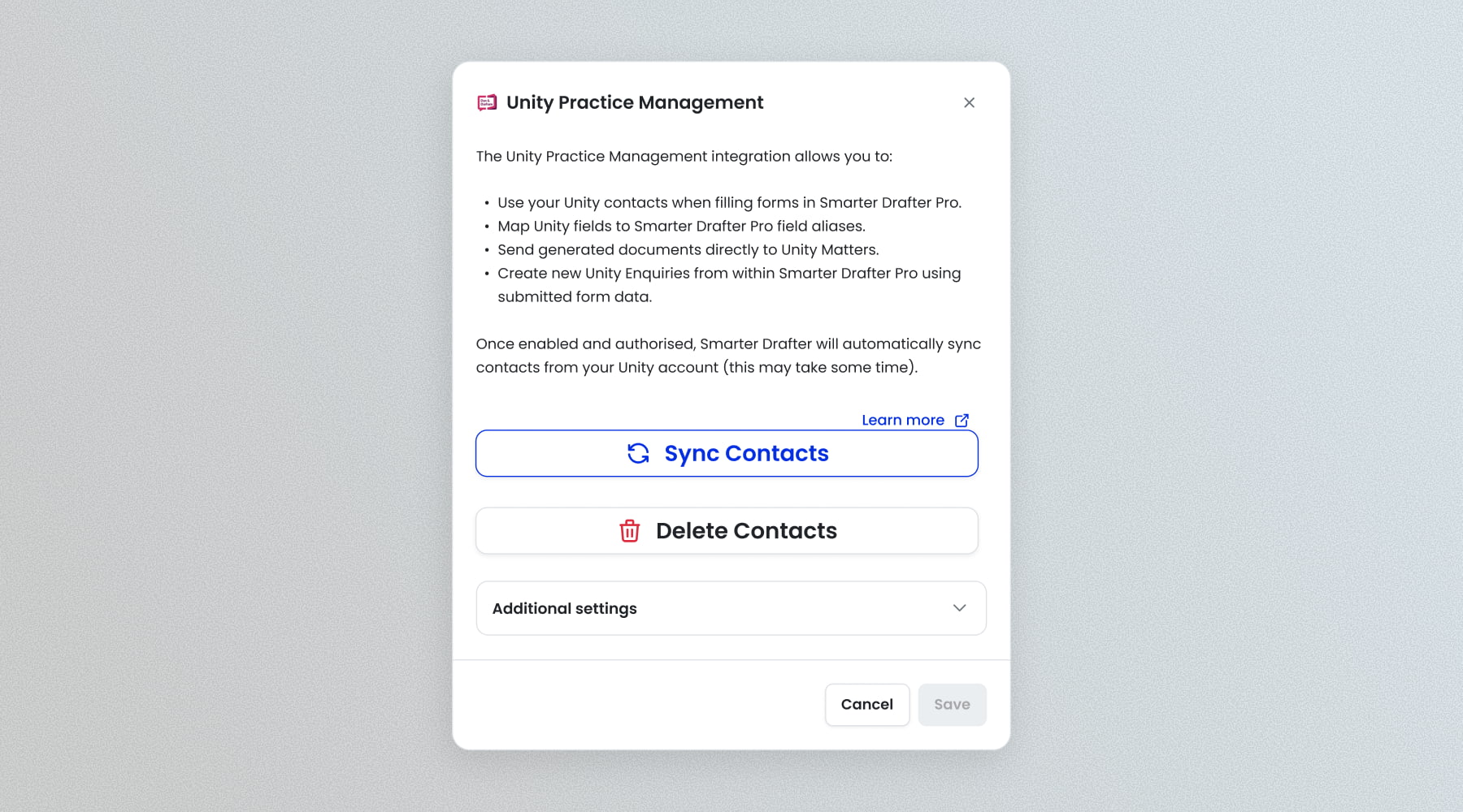 Finalised documents are uploaded from Smarter Drafter Pro to Unity at the point of submission, eliminating manual steps.
