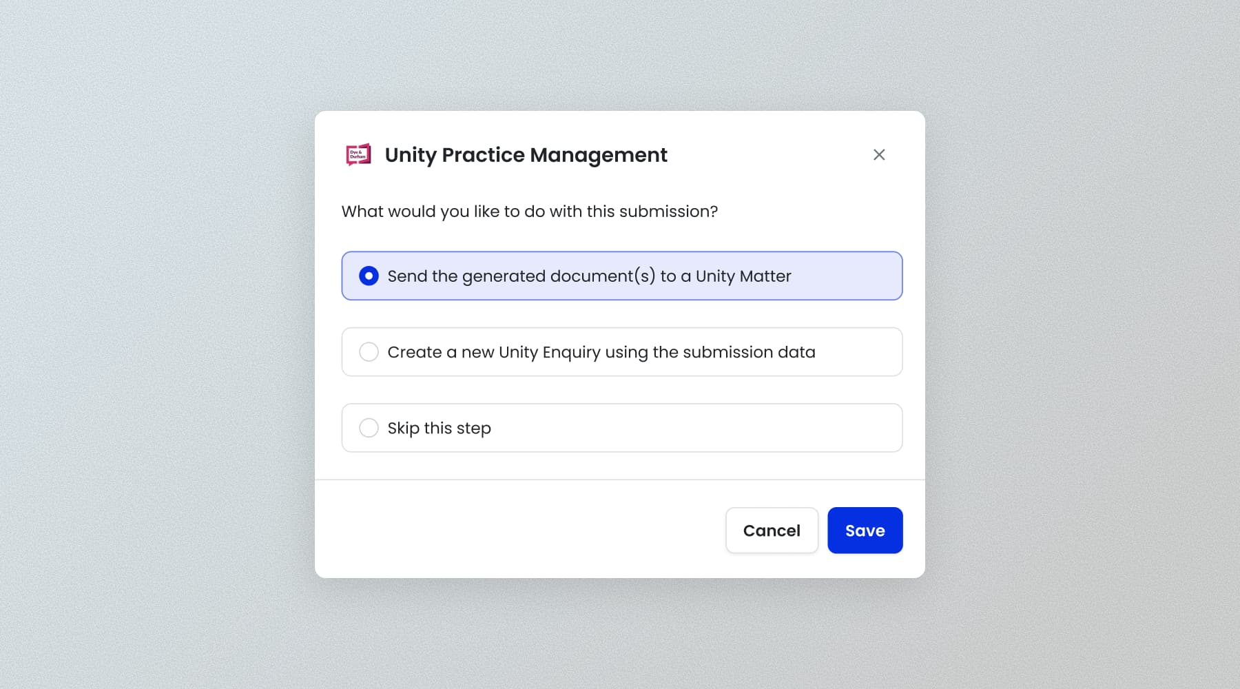 Documents are linked to the right Unity matter, preserving accuracy in client and matter records.